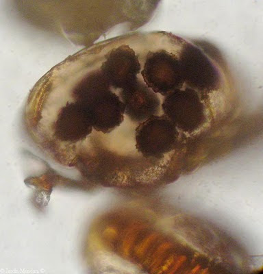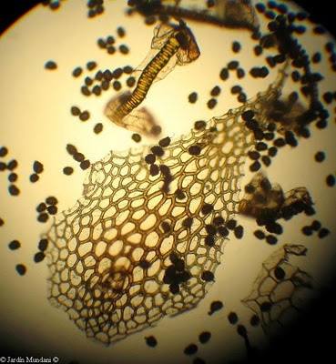 Esporas de doradilla contenidas en la bolsa transparente de un esporangio, esperando a que se despliegue como una pequeña catapulta y las disperse lo más lejos posible.