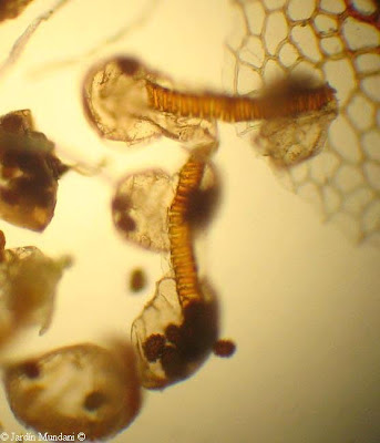 Detalle microscópico de una pálea de doradilla, rodeada de esporas y esporangios ya desplegados y vacíos.