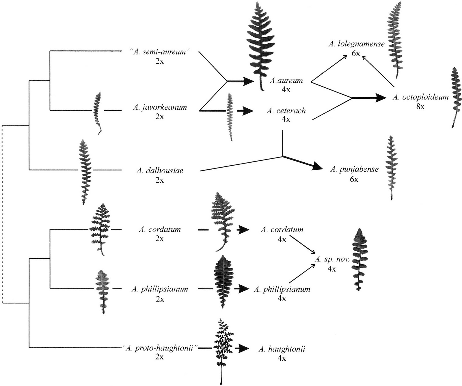 Arbol genealógico de la família del Asplenium javorkeanum y su descendiente el Asplenium ceterach con la silueta de sus frondes. Dibujo tomado del excelente artículo "Phylogenetic analysis of Asplenium subgenus Ceterach (Pteridophyta: Aspleniaceae) based on plastid and nuclear ribosomal ITS DNA sequences".