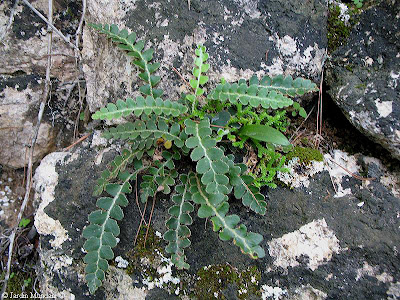 Doradilla con largas frondes de unos 20 cms. con pinnas más separadas, borde ligeramente crenado y pecíolo largo de color claro, conviviendo en el mismo hábitat con otros ejemplares de aspecto normal, en la maravillosa finca pública de Planícia, ubicada en el municipio de Banyalbufar de la Isla de Mallorca.