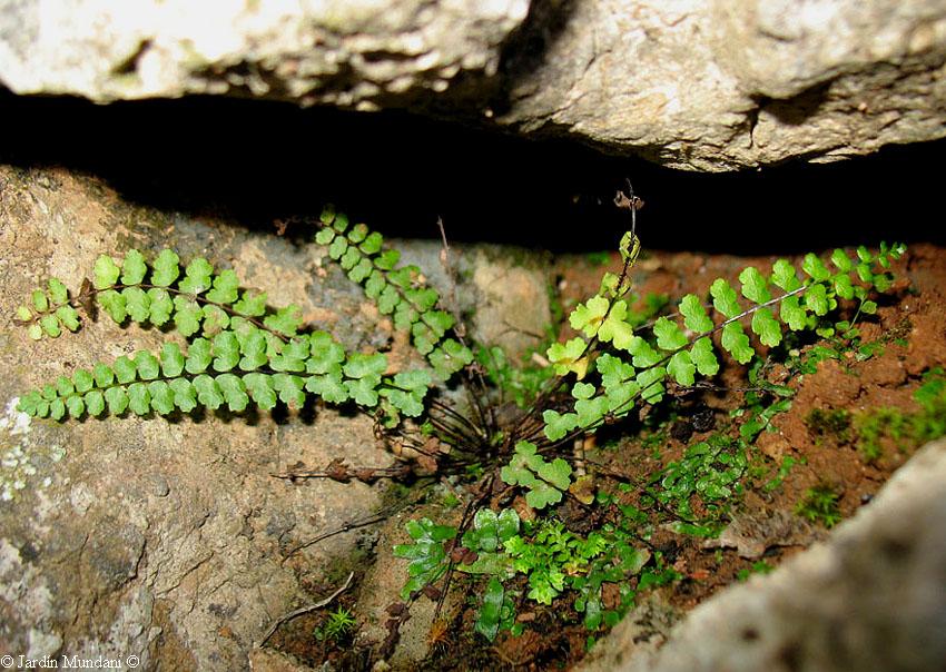 Otra fronde de este extraordinario híbrido. En este ejemplar las pinnas tienen la forma típica de su progenitor Asplenium petrarchae ssp. petrarchae, pero carecen de tricomas, salvo las más proximales. (Doble click encima de la foto para ampliarla)