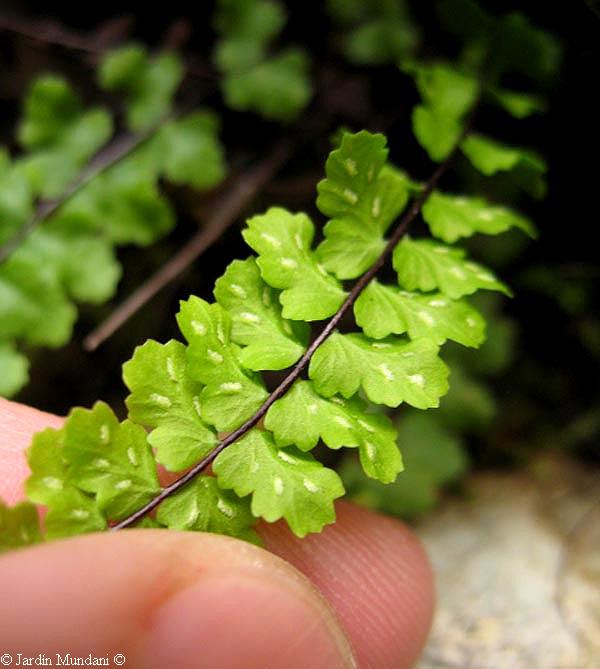 Al dar la vuelta a uno de sus frondes vemos que los soros son más bien escasos y tienen una distribución semejante a los del Asplenium petrarchae subsp. petrarchae. Llama mucho la atención el raquis brillante y muy oscuro casi negro, herencia del Asplenium trichomanes subsp. quadrivalens. (Doble click encima de la foto para ampliarla)