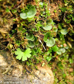 En esta otra foto se ven un grupo de gametofitos o prótalos sobre un sustrato de musgo, que actúa como una esponja y absorbe la humedad del rocío matinal, facilitando el desarrollo de las Anogrammas. Se ve también un fronde nuevo o esporofito, que ha brotado de una oósfera fecundada. Foto hecha en octubre en una pared de bancal del Valle de Sóller.