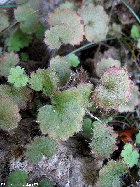 Hojas velludas de Sibthorpia africana. Vive en lugares sombríos, húmedos y frescos orientados hacia el norte.