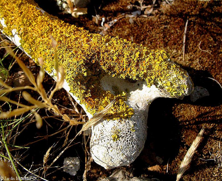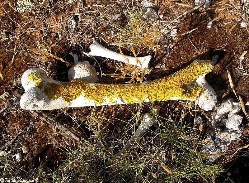 Fémur de oveja con varias Xanthoria parietina que han confluido en su crecimiento exuberante por la riqueza en nutrientes del hueso. Llama la atención la ausencia de crecimiento en la parte no soleada del hueso, por la necesidad de luz solar del alga simbionte, cuya clorófila depende de los rayos solares para realizar la fotosíntesis.
