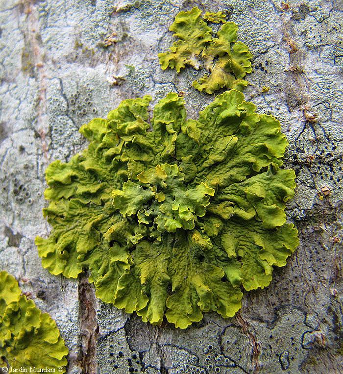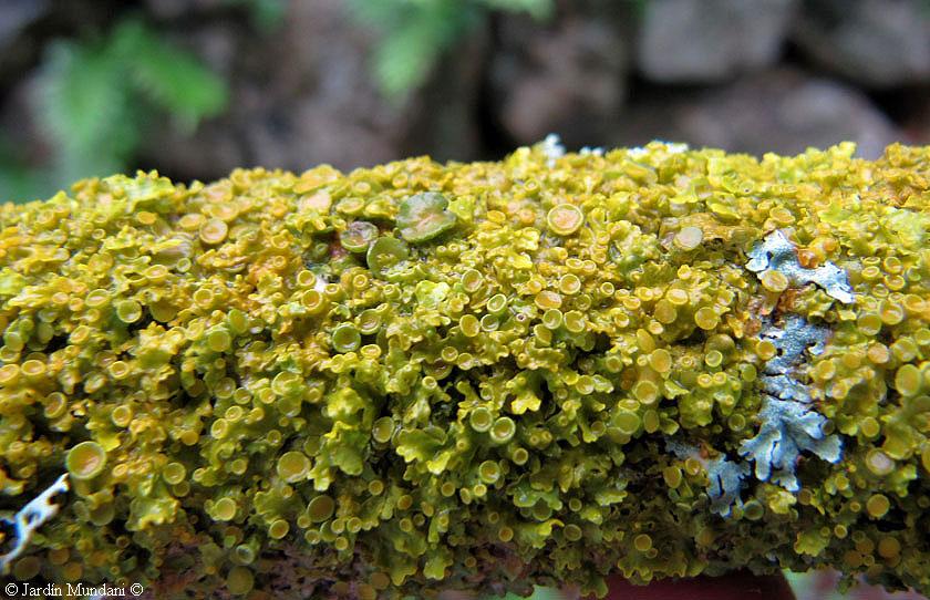 Vigorosa Xanthoria parietina con un crecimiento exuberante sobre la corteza de un saúco, Sambucus nigra. El intenso color verde es debido a la humedad de la corteza porosa del saúco, que actúa como una esponja reteniendo el agua de lluvia, de manera que el liquen obtiene un abundante aporte hídrico.