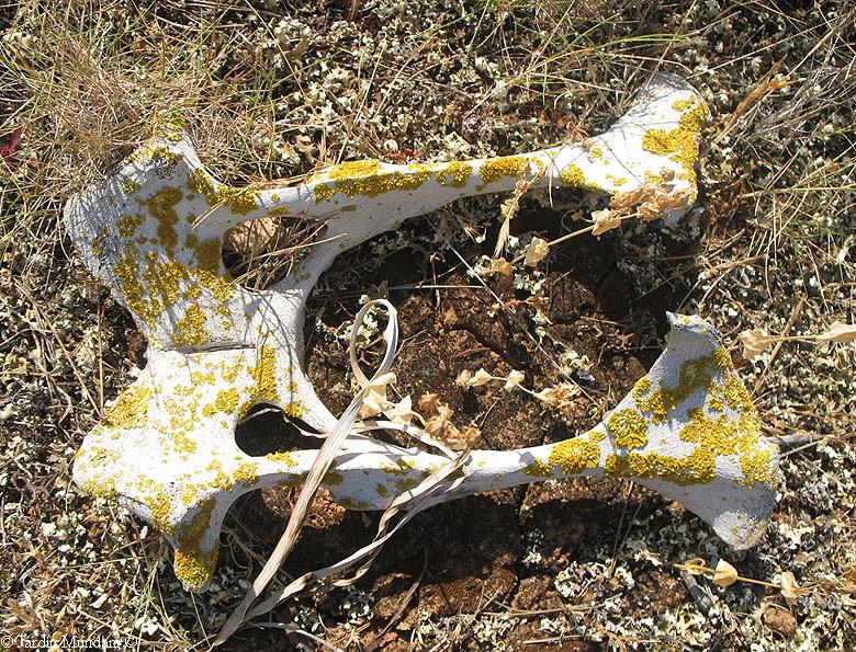 Pelvis ósea de una oveja muerta colonizada por Xanthoria parietina, en una garriga reseca muy soleada del sur de la Isla de Mallorca. (Doble click encima de la foto para ampliarla)