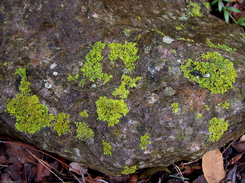 Y para finalizar en esta foto se puede ver un grupo de Xanthoria parietina creciendo sobre una roca muy húmeda y sombreada en un espeso encinar de la Serra de Tramuntana de Mallorca. Se aprecia el color verdoso que adquiere el liquen en estas condiciones humedas y con escasa luz.