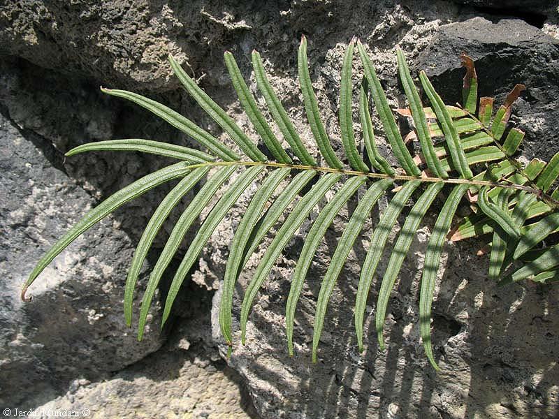 Fronde del helecho anterior con sus largas pinnas coriáceas de borde entero.