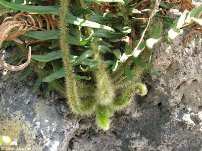 Pecíolos de Pteris vittata mucho más cortos que la lámina de hasta 15 cms. cubiertos de tricomas.