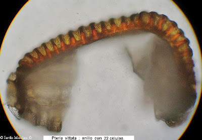 Esporangio de Pteris vittata con la bolsa vacía tras dispersar las esporas. El anillo cuenta con numerosas células de un vivo color fuego. (Doble click encima de la foto para ampliarla)