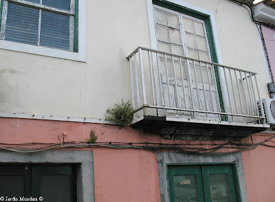 Fachada de una casa en la ciudad de Horta de la Isla de Faial con varios ejemplares de Pteris vittata. Los azorianos se ven obligados a arrancar cada año los numerosos helechos que crecen en las fachadas de sus casas.