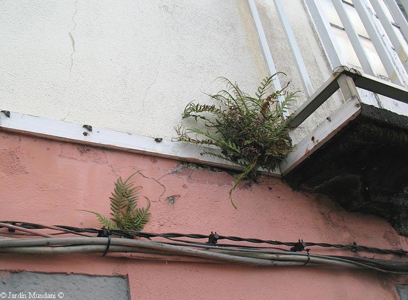 Pequeña Pteris vittata creciendo asilvestrada en una grieta de la fachada de una casa de la ciudad de Horta en la Isla de Faial del Archipiélago de las Azores. En estas islas atlánticas este helecho alóctono se ha convertido en una verdadera plaga, favorecido por la alta humedad ambiental durante todo el año.