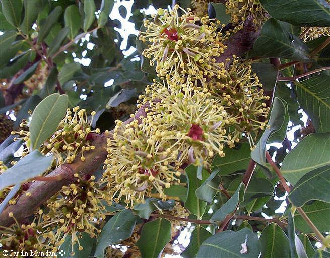 Inflorescencias de un algarrobo hermafrodita con estambres y pistilos repartidos a lo largo del tallo central rojo. Para evitar la autofecundación, en primer lugar se abren las flores femeninas con sus nectarios repletos de rico néctar para atraer a las abejas con el cuerpo cubierto del polen de las flores masculinas de otro algarrobo.