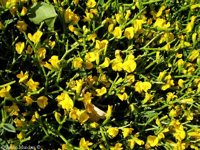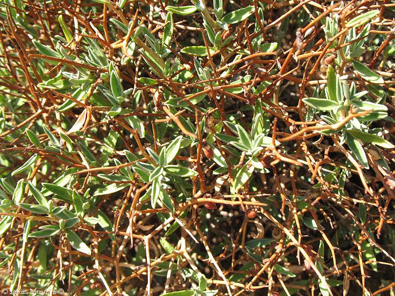 Dorycnium fulgurans cultivado en el Jardín botánico de Sóller. Sus espinas son los extremos de los tallos muy ramificados e imbricados que acaban en punta. Sus pequeñas y escasas hojas son parecidas a las del Dorycnium pentaphyllum.