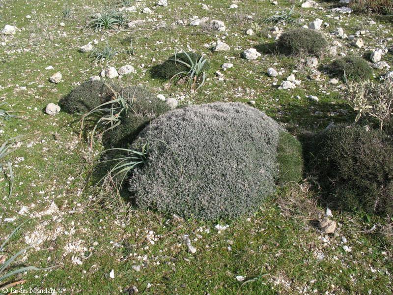 Teucrium subspinosum cultivado en el Jardín botánico de Sóller para preservarlo de la extinción. Su número en estado silvestre es muy escaso y su hábitat está continuamente amenazado por la codicia humana.