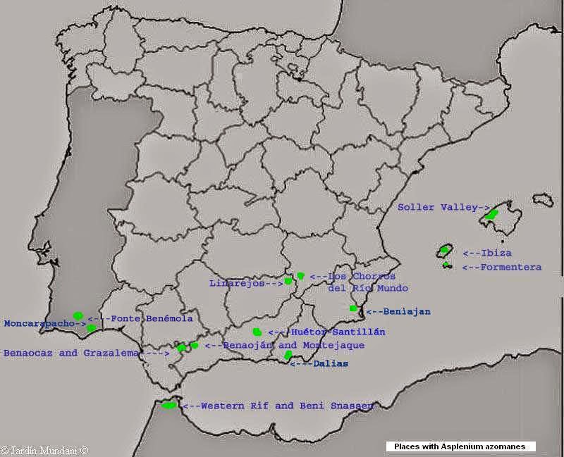 Asplenium azomanes en la grieta de una roca calcárea orientada hacia el noroeste. La foto fue tomada en las montañas que circundan el Valle de Sóller, situado en plena Serra de Tramuntana.