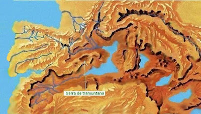 Mapa aproximado del Mediterráneo occidental durante el Mioceno Tardío. La Serra de Tramuntana formaba parte del Macizo Bético-Rifeño. El nivel del agua de los lagos salobres aumentaba o disminuía dependiendo de las lluvias, de manera que durante algunos milenios permanecieron prácticamente secos.