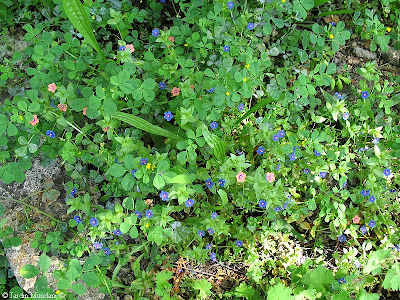 Esta Anagallis arvensis tenía flores de distintas tonalidades azul celeste, algunas casi blancas. En el centro presentaban un llamativo color fuchsia.