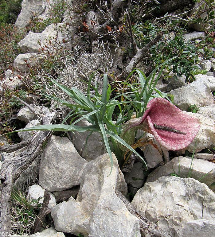 La planta Helicodiceros muscivorus es una campeona de la supervivencia. Durante millones de años sufrió mutaciones adaptativas que iban transformando su aspecto hasta lograr la perfección actual. Pertenece a la família de las Araceae. Recibe también los nombres de Dracunculus muscivorus y Arum muscivorum. Es una reliquia del Mioceno que en la actualidad puebla las costas rocosas de las islas e islotes que hace unos 6 millones de años conformaban la región Tirrénica: las Islas Baleares, Córcega y Cerdeña, siempre cerca de las colonias de gaviotas.