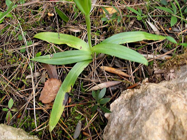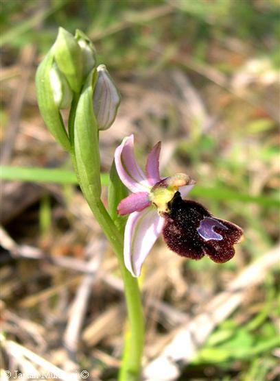 Ophrys balearica iniciando la floración a principios de abril. Se ven bien las hojas basales y una hoja caulinar en el tallo.