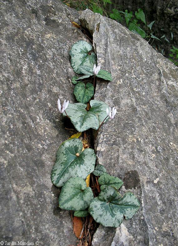Curiosa imagen con una hoja adulta a la izquierda junto a numerosas hojas mucho más pequeñas, cada una de las cuales corresponde a un pequeño Cyclamen balearicum recien nacido. Las semillas habrían quedado retenidas en la grieta tras ser arrastradas por la lluvia.