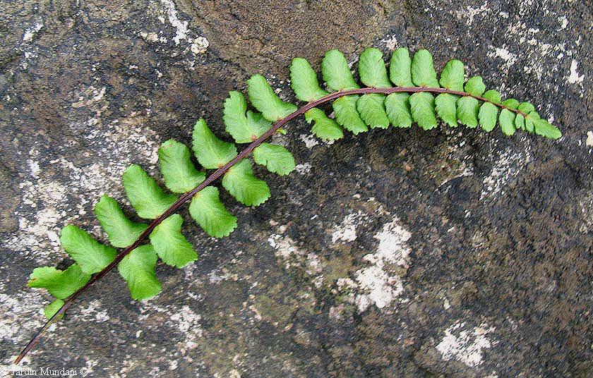 Aquí podemos ver las pinnas de una fronde del Asplenium azomanes anterior. Aunque su fenotipo se acerca más al tipo sombreado, sus pinnas se ven gruesas, coriáceas y brillantes como de plástico con las típicas nerviaciones muy marcadas y el borde ligeramente crenado. Llaman la atención las dos alas suberosas que recorren todo el raquis dibujando un canal. Esta característica es típica de todos los helechos del complejo trichomanes al que pertenece el Asplenium azomanes.