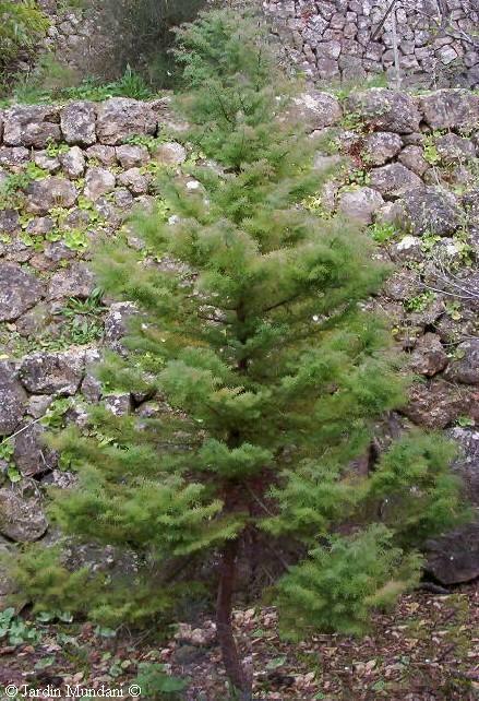 masculinas cargadas de polen. Las hojas juveniles de esta variedad de jardín parecen agujas pero tienen un tacto muy suave.