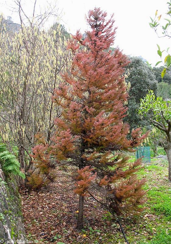 La misma cryptomeria durante el invierno. Para protegerse del frío y evitar la congelación las hojas sintetizan antocianos y adquieren un bellísimo color marrón rojizo. Cuando aumentan las temperaturas en primavera, las hojas se vuelven otra vez verdes.