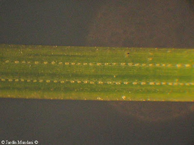Borde finamente dentado de una acícula de pino canario vista al microscopio a 40 aumentos. Llaman la atención las cuatro hileras de puntitos formados por pequeños estomas, que se abren o cierran según el grado de humedad ambiental.