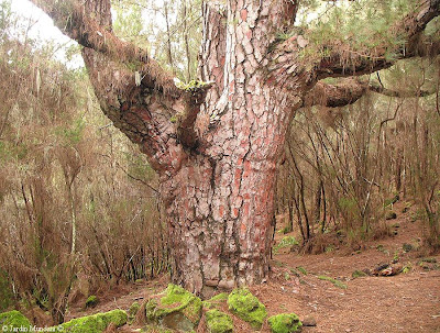 Paseando por el interior de un exuberante bosque de Laurisilva me encontré de súbito con este majestuoso pino canario. Caminaba cabizbajo mirando los pequeños helechos del sotobosque y de pronto se obscureció la escasa luz filtrada por las copas de los gigantescos brezos Erica arborea, los más altos que jamás había visto. Esto me sorprendió y levanté la mirada para conocer la causa. Me encontraba a menos de tres metros del tronco del pino y no me había dado cuenta de su presencia. Las primeras milésimas de segundo tuve la impresión de encontrarme ante un gigante ciclópeo y me asusté. Estaba muy oscuro bajo la inmensa copa de aquel pino descomunal y sus ramas como largos brazos ascendentes me espantaron. Si ampliáis la imagen con un doble click veréis que no exagero. Tuve que hacer la foto con flash y no se aprecia la oscuridad de este bosque maravilloso que se encuentra a unos 1.800 msnm en la ladera norte del cráter del Teide. Un poco a ojo le calculé un grosor de tronco de un metro y medio y una altura de unos 20 metros.