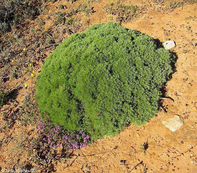 Este lentisco me pareció la planta más alta. El azote incesante del viento le había dado una forma aplanada como si lo hubiera recortado un jardinero. Abajo se ve un Thymus camphoratus, las flores amarillas de varias Pulicaria odora y un cojinete de monja de Ulex erinaceus.