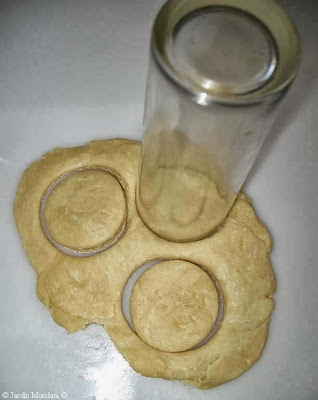 Cuando la masa ha empezado a hincharse por la acción de la levadura, la he aplanado con un rodillo y he ido recortando las galletas con la ayuda de un vaso de boca estrecha.
