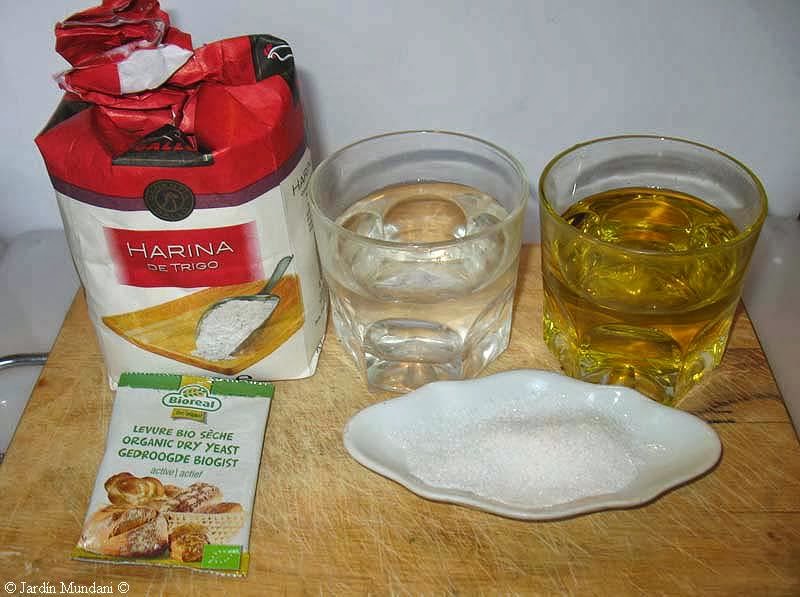 Para empezar he diluido media bolsita de levadura desecada en medio vaso de agua tibia, a la que he añadido una pizca de azúcar y un poco de harina para activar la levadura, dejándolo reposar unos minutos. En un lebrillo he echado medio vaso de aceite de oliva de buena calidad, el medio vaso de agua tibia con la levadura y un poco de sal y he ido añadiendo harina de trigo hasta que la masa resultante se ha despegado de mis manos y de las paredes del lebrillo, amasándola un rato con las manos y formando luego una bola que he dejado reposar unos minutos.