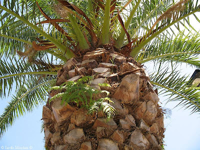 Pteridium aquilinum creciendo como epifita sobre el tronco de una palmera canaria, Phoenix canariensis, en la ciudad de Barlovento de la Isla de la Palma.