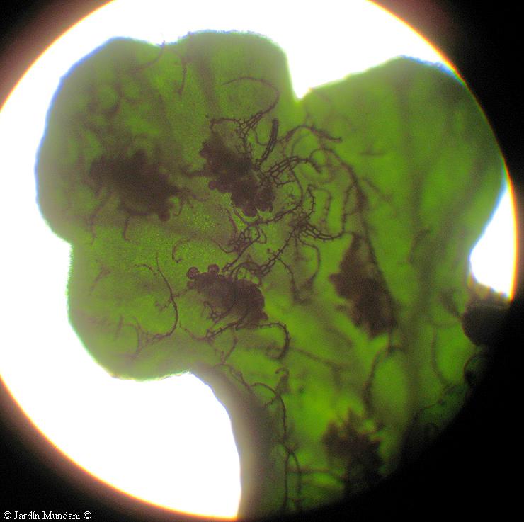 Corte transversal del tallo anterior totalmente invadido por el micelio, que en esta planta de tallo herbáceo adopta una disposición diferente a las plantas leñosas.