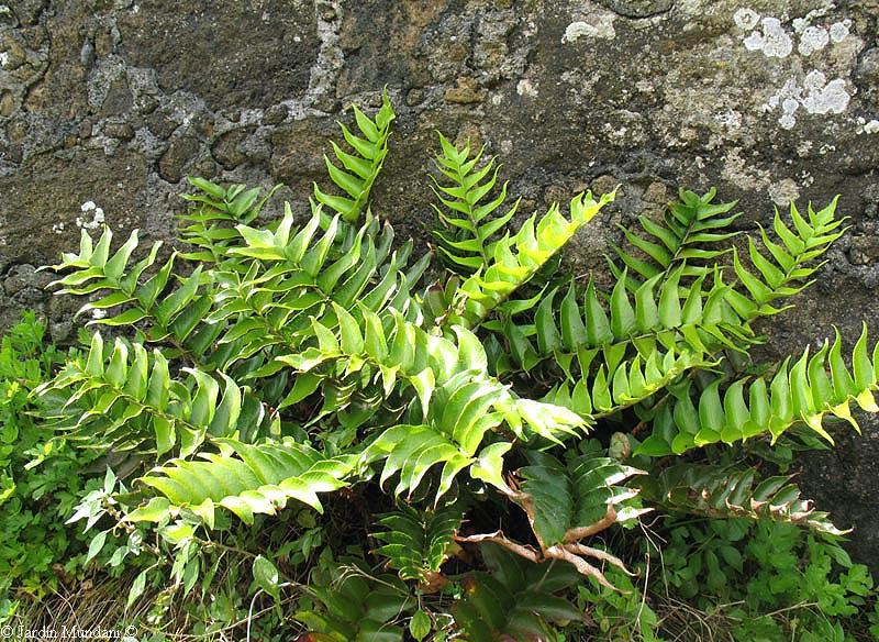 Estos ejemplares de Adiantum hispidulum crecen entre las piedras de una pared que bordea la carretera que sube al crater del volcán Caldeira do Faial. Están rodeados por los sarmientos de otra alóctona asilvestrada, la americana Tradescantia fluminensis.