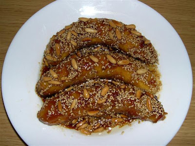 Se pone un poco de aceite vegetal o mantequilla en una sartén y se tuestan los piñones. Cuando han cogido un color tostado claro, se añade el sésamo (semillas de la planta Sesamum indicum) y a continuación un par de cucharadas de miel, bajando el fuego al mínimo. Se pelan dos o tres plátanos por persona y se añaden enteros a la sartén encima de los demás ingredientes, a los tres minutos se les da la vuelta y se dejan otros tres minutos, siempre a fuego lento. Están deliciosos.