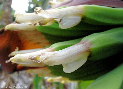 Flores femeninas partenocárpicas de platanera canaria con su largo y grueso pistilo rodeado por dos tépalos blancos: el superior es más largo que el pistilo y el inferior más corto. Estos pistilos son cortados con un cuchillo especial con la intención de facilitar el engorde del fruto y dar un mejor aspecto a los plátanos a la hora de comercializarlos.