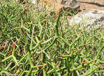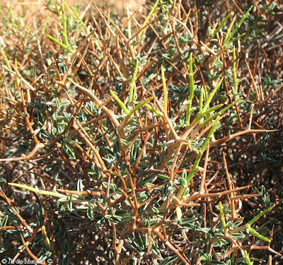 Tallo tierno de Femeniasia balearica a principios de junio. Cada uno de los pequeños brotes acaba en tres espinas divergentes.