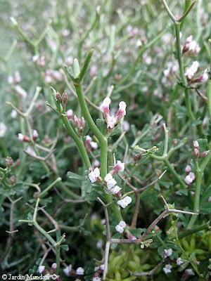 Teucrium subspinosum cultivado en el Jardín botánico de Sóller para preservarlo de la extinción. Su número en estado silvestre es muy escaso y su hábitat está continuamente amenazado por la codicia humana.