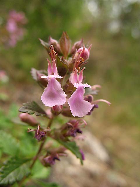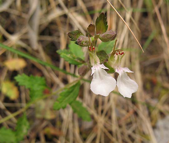 Esta diminuta labiada de hábito rastrero, el Teucrium chamaedrys subsp. pinnatifidum, dirige sus bellísimas flores hacia el sol del mediodía. Crece en un brezal situado en la falda de una montaña de la Serra de Tramuntana de Mallorca.