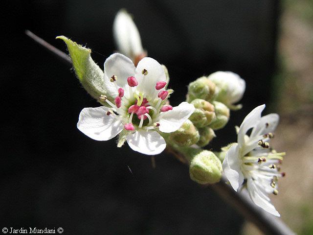 Sus pequeñas flores de un blanco inmaculado son muy perfumadas y en Mallorca se abren a finales de invierno, algo más tarde en regiones más frías. Se puede observar arriba a la izquierda una espina fina como una aguja que protege las flores y las hojas del hocico de los herbívoros.