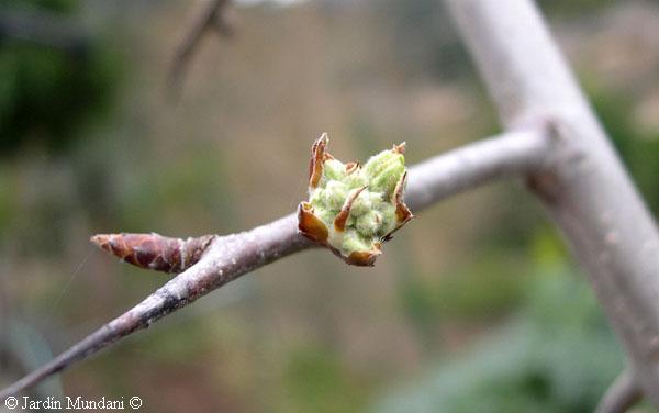 Yema floral iniciando el crecimiento de los capullos a finales de febrero. Se ve también una yema vegetativa que empieza a crecer unas semanas después de iniciarse la floración y en el extremo del tallo una peligrosa espina de tres centímetros.