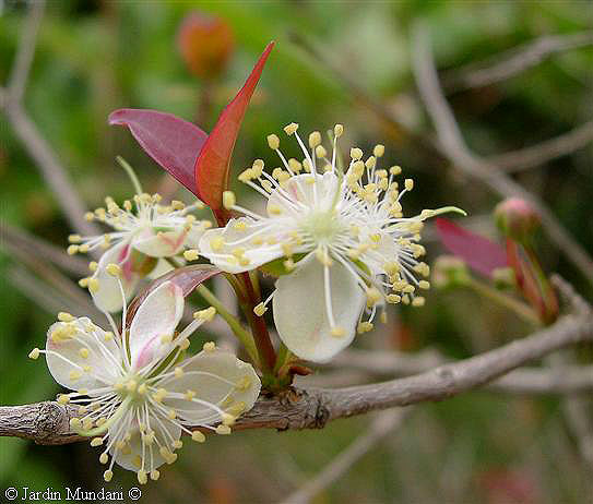 Flores de Pitanga del Surinam en abril. Tienen la estructura típica de todas las mirtáceas. Llama la atención la tenue línea rojiza que recorre los pétalos y el vivo color rojo sangre de las hojas.
