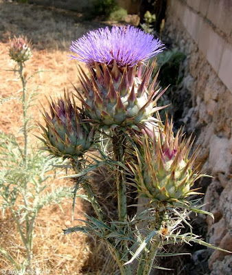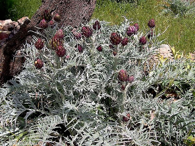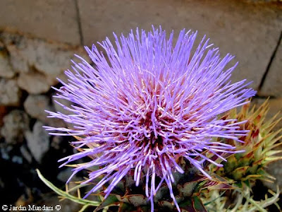 Fantástica alcachofera híbrida entre Cynara cardunculus y Cynara scolymus de la variedad morada mallorquina.